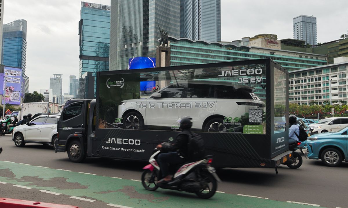 JAECOO J5 EV Keliling Sudirman–Thamrin Pakai Truk Transparan